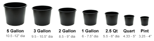 Pot sizes typically available include: 1 Gallon, and 3 Gallon. See the diagram below for the different pot sizes. Generally, available pot size and specific shrubs on hand do vary. So, please give us a call. We do our small part to help mother nature by using recycled plastic plant pots.
