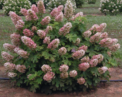 | Special Features | Large 9” long cone shaped flowers blooms white, turns pale pink, then deepen to rose color. Blooms in the late Spring through Summer. Blooms stay upright even after hard rains unlike other hydrangeas. Dark green oak like leaves turn mahogany in the Fall for visual attraction. Very low maintenance. Disease, drought (established in part shade), heat, humidity, and insect resistant. Attracts butterflies. |